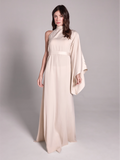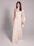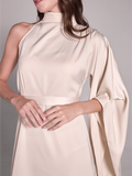 This floor length dress features an asymmetrical halter neck and one shoulder long sleeve, adding a touch of sophistication to any occasion. A self tie belt cinches the waist for a flattering silhouette, while the concealed back zipper ensures a seamless fit. Crafted from luxurious satin, this dress exudes elegance and refinement. Dry clean only.