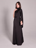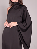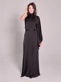 Effortlessly elevate your evening attire with our luxurious satin dress. The asymmetrical halter neck and one shoulder long sleeve create a sophisticated silhouette, while the floor-length design exudes elegance. Complete with a self-tie belt and concealed back zipper, this dress is perfect for any special occasion. Dry clean only for long-lasting wear.
