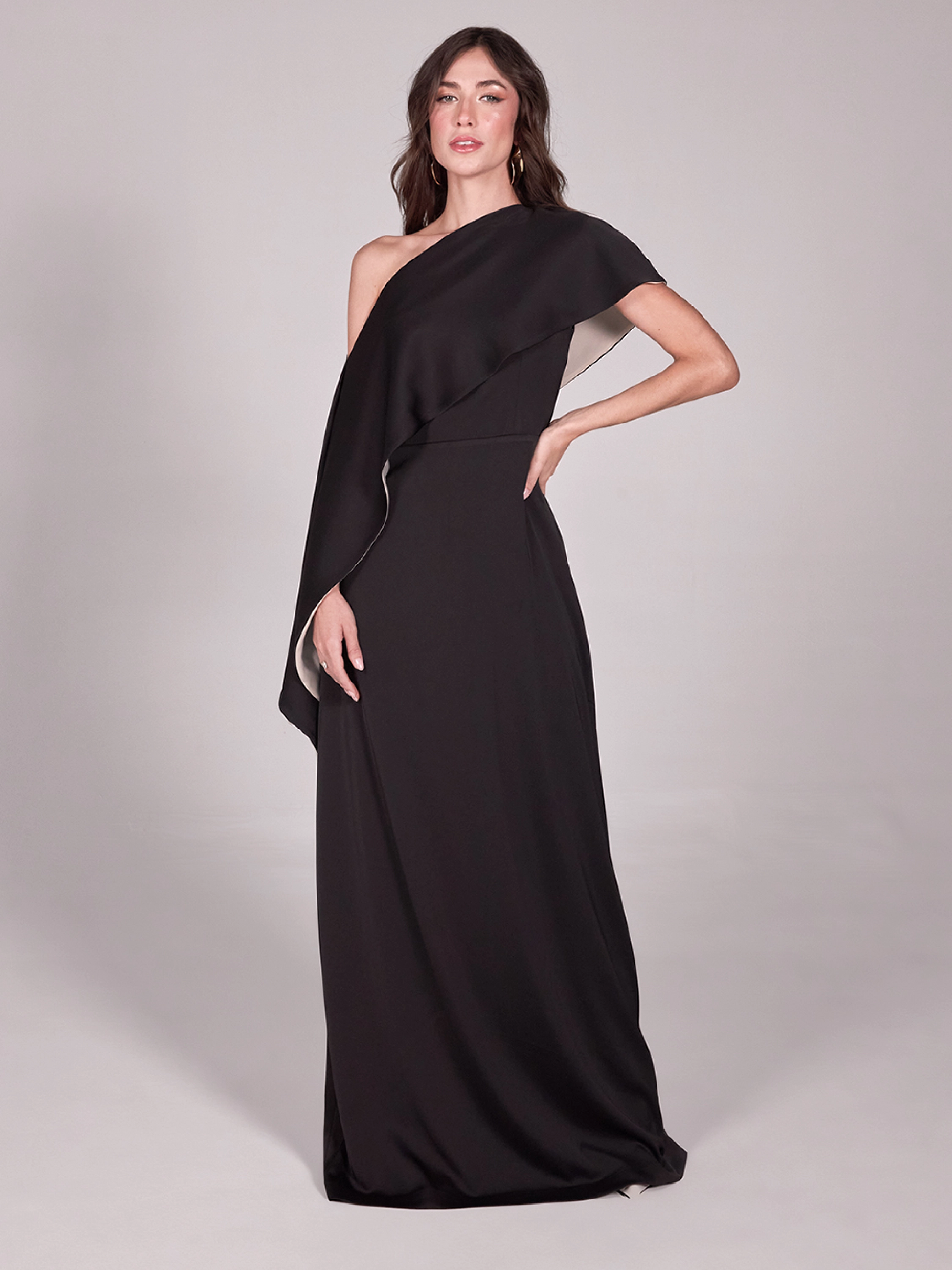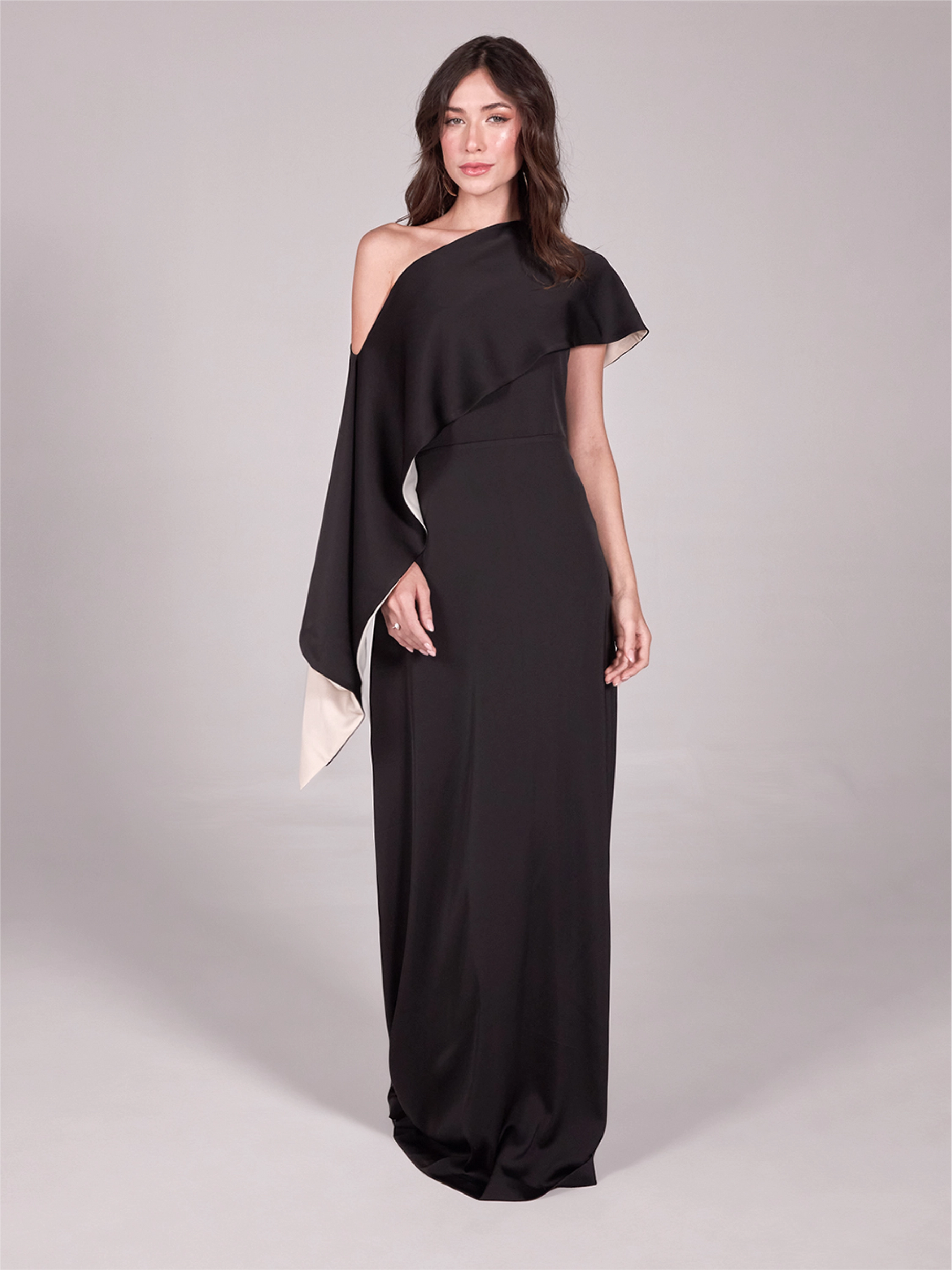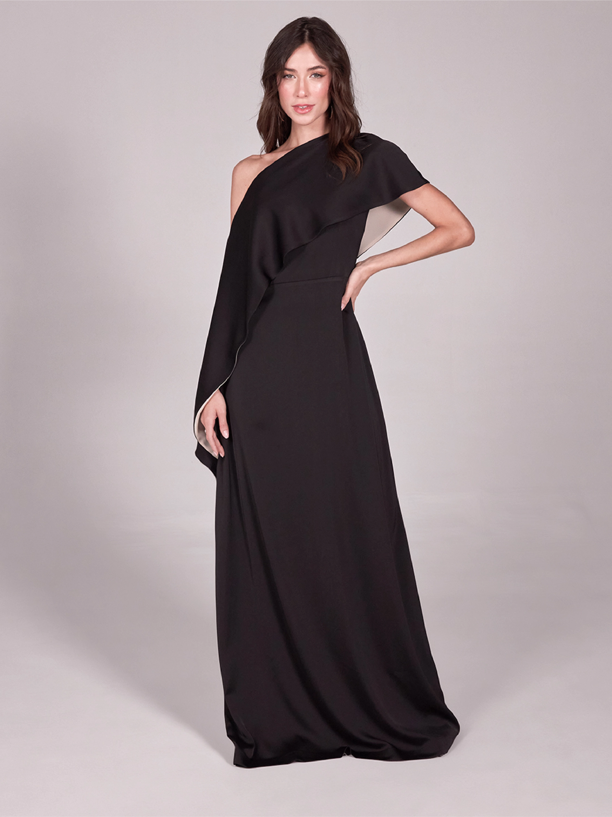 This luxurious satin dress boasts a stunning asymmetrical neckline and a removable one-shoulder flared outer. With a sleeveless design and invisible zip line, this dress exudes elegance and sophistication. Perfect for evening events and special occasions, it's a must-have for any celebration.